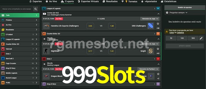 O 999Slots oferece uma grande seleção de opções de apostas em e-sports com probabilidades competitivas